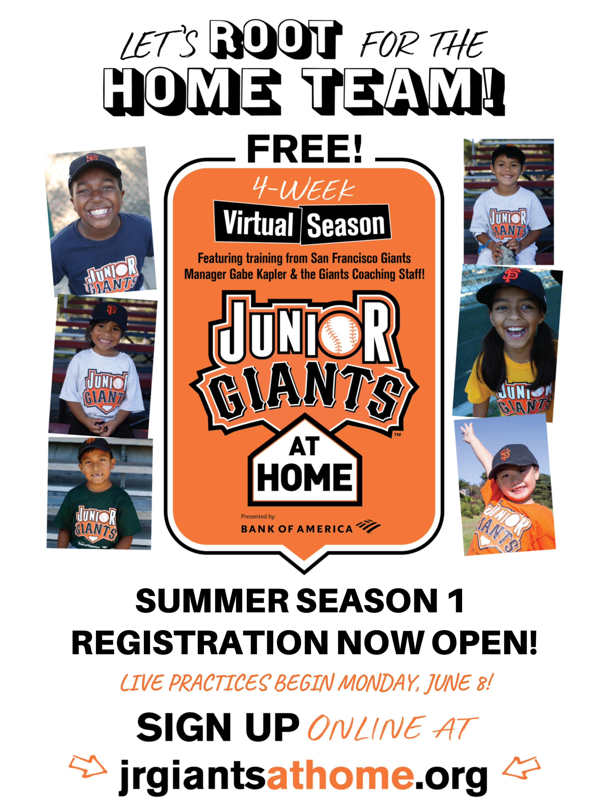 Junior Giants at Home is two 4-week seasons where kids can stay active and connected through live, age-specific practices that include indoor friendly skills & drills, Word of the Week talks and exclusive training videos from the San Francisco Giants Coaching Staff!
