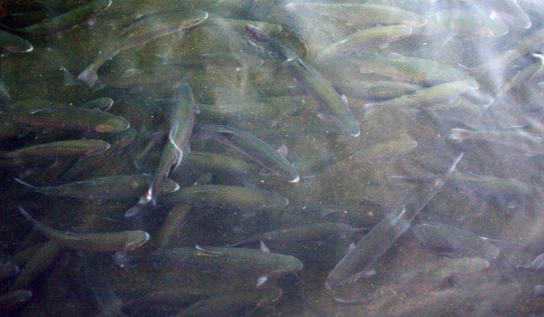 From 7:30AM to 3:30PM daily, visitors can observe and feed the rainbow trout at the Moccasin hatchery. The fish live and grow in long rectangular pools, protected from predators by a tall chain-link fence and overhead wires.