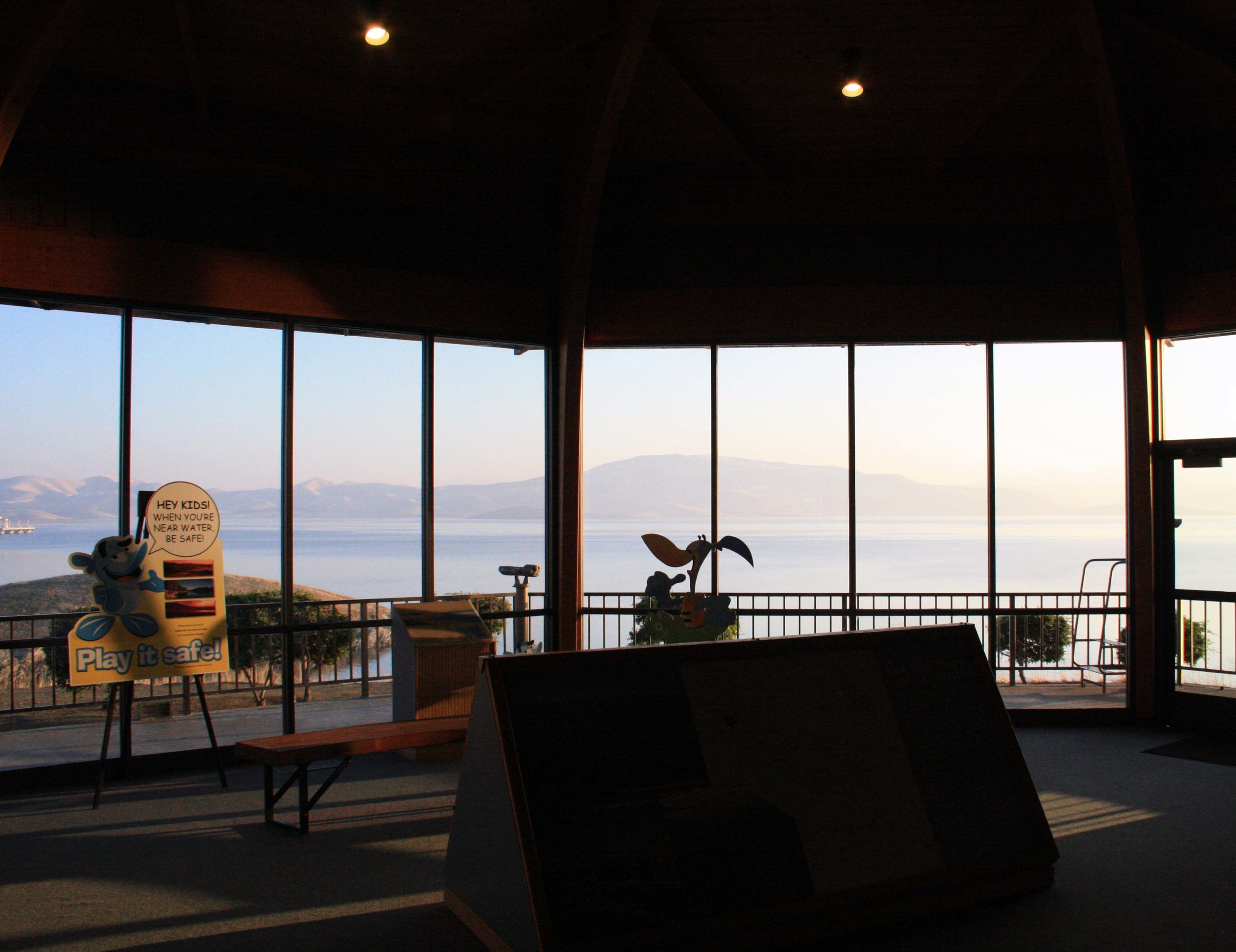 From the patio behind the visitor center, visitors can use free telescopes to view the lake and the surrounding hills.