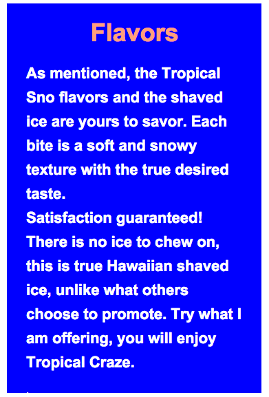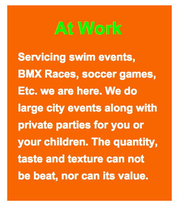 Delicious and large powdered made flvors, not syrups. We give back to local organizations as in swimming teams, soccer leagues, BMX organizations, festivals, and have a base price for parties.